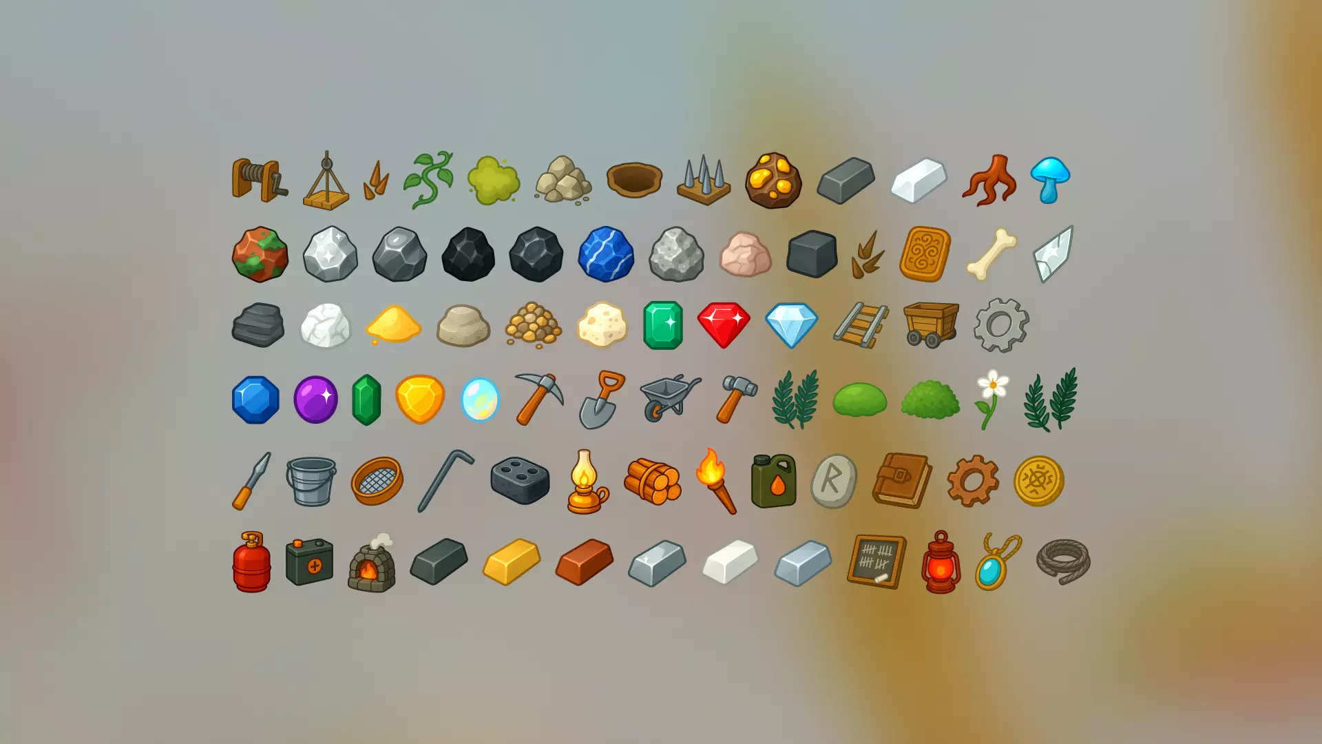 - Icons: Resource icons (coal, gold, stones, gems), tools (pickaxe, shovel, hammer), materials (metal bars, wood planks, etc.)